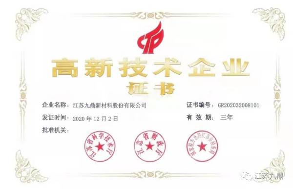 經全國高新技術企業認定管理工作領導小組辦公室、江蘇省科學技術廳、江蘇省財政廳、國家稅務總局江蘇省稅務局等有關部門的嚴格審核,九鼎新材順利通過江蘇省2020年度第一批高新技術企業復審。